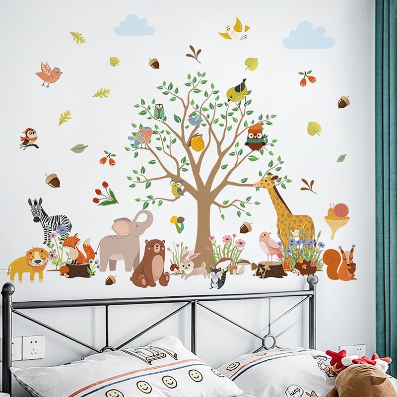 MagiMural Cartoon Jungle Animal Tree Wall Stickers, Elephant Giraffe Lion Bear Peel and Stick Wall Decals, Baby Room Nursery Kids Bedroom Art Wall Decor