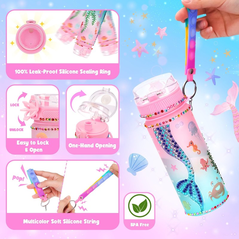 Magisches Meerjungfrau DIY Wasserflaschen Bastelset für Kinder 3–12 Jahren: Glitzernde Edelsteinaufkleber und Malset, Kreatives Geburtstageschenk für 5 6 7 8 9 jährige Jungen Mädchen