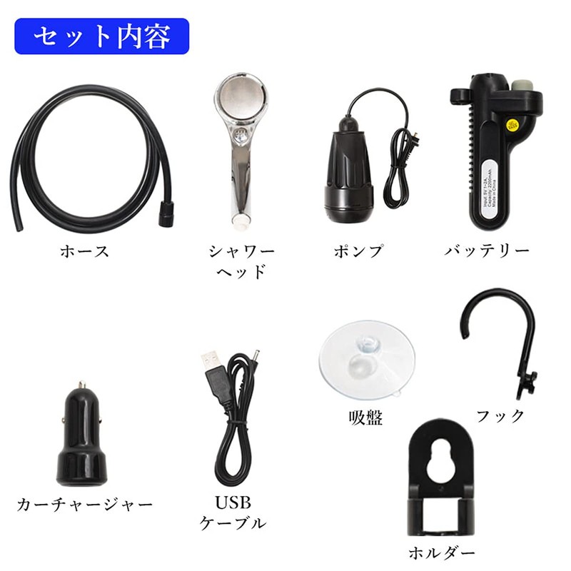 - 小型充電式バッテリーでどこでもシャワー 専用シガーチャージャーで、車からの給電も可能となりました。