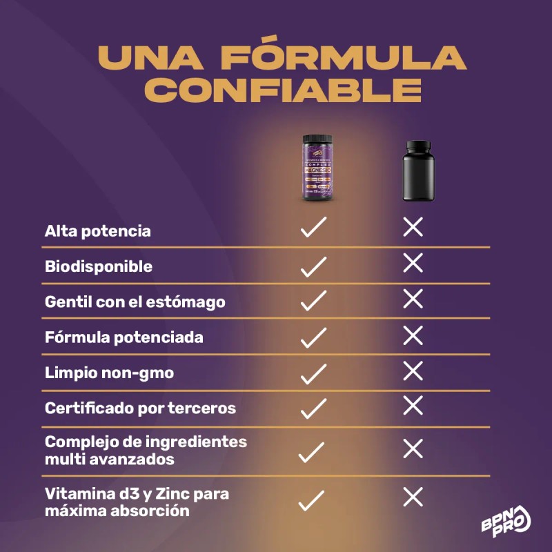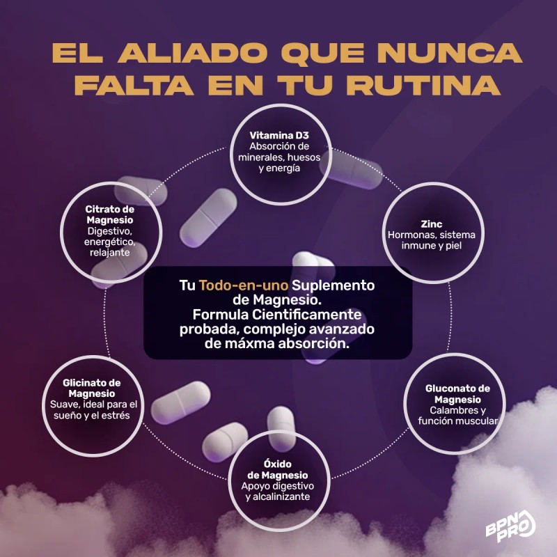 - 4 tipos de magnesio: citrato, óxido, gluconato y glicinato para mejor absorción y eficacia en todo el cuerpo.