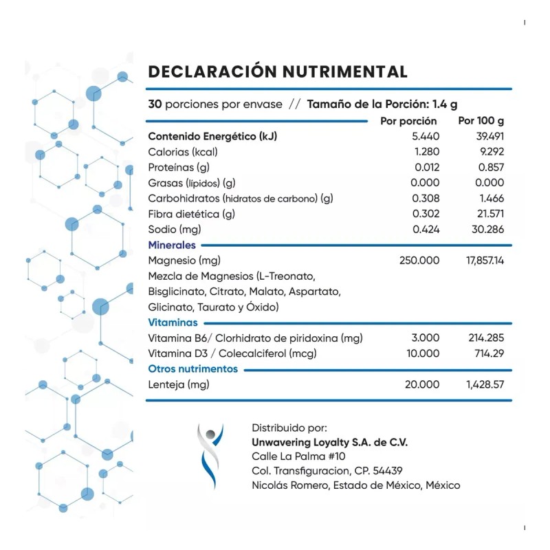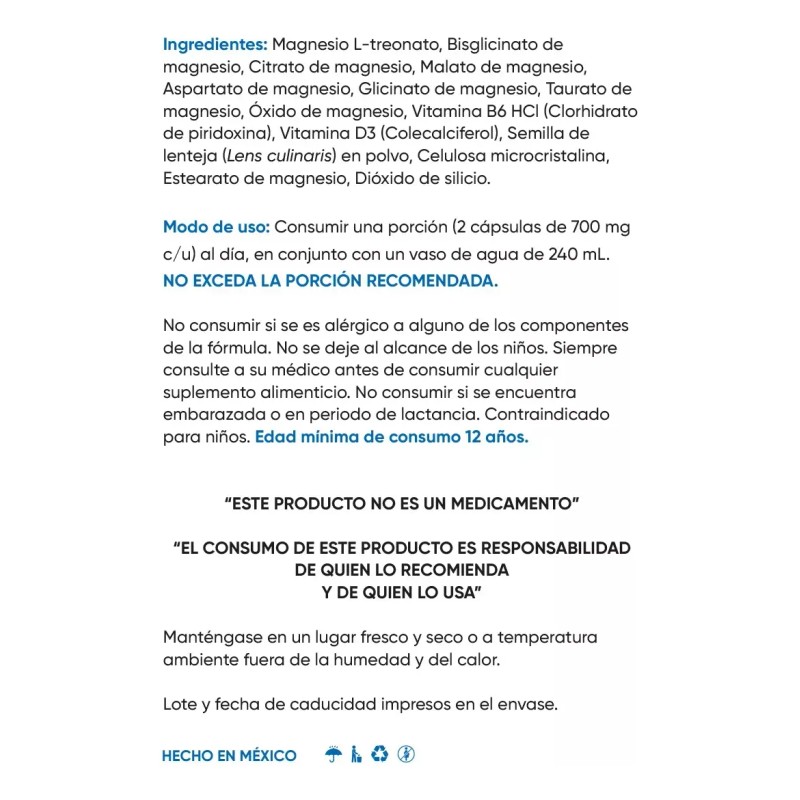 -Ingredientes: Treonato, Bisglicinato, Citrato, Malato, Aspartato, Glicinato, Taurato, Oxido de Magnesio, Vitamina B6 (piridoxina), D3 (colecalciferol)