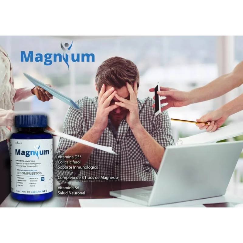 Magnium, adicionado con vitamina B6 Y D3 . Es un complejo de magnesio que aporta soporte al sistema nervioso , muscular, óseo , cardiovascular, inmune y función neurologica normal.