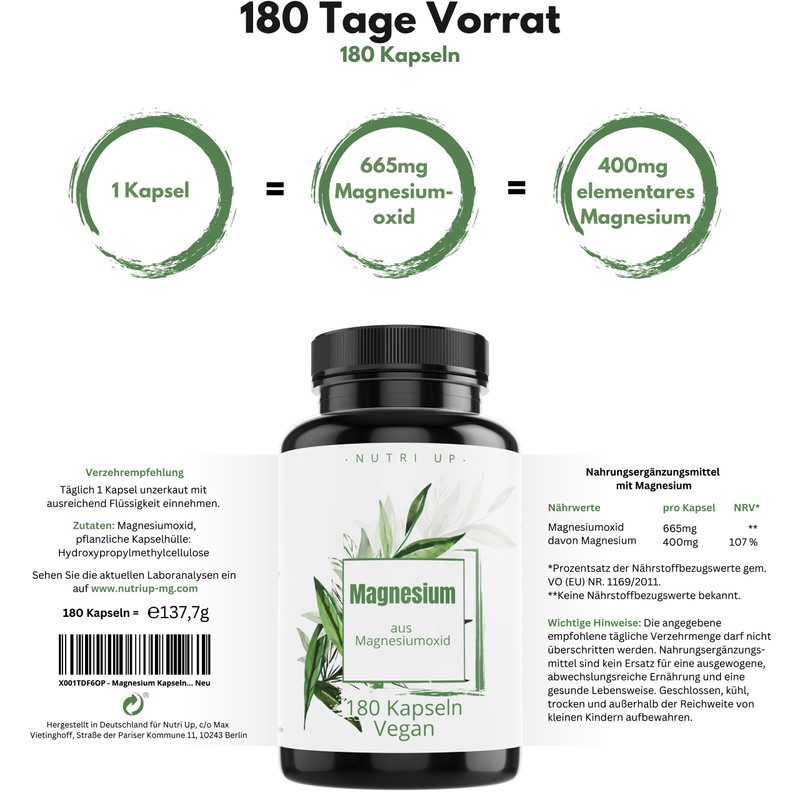 - High dose pure magnesium: 665 mg marine magnesium oxide, of which 400 mg elemental magnesium per capsule. 180 capsules for 6 months (1 capsule per day).