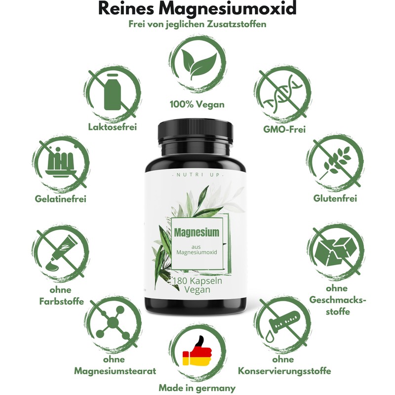 - Valuable depot effect: the current scientific study situation indicates that the body stores magnesium from magnesium oxide better in the cells after several weeks than other magnesium compounds. This makes it interesting for long-term needs coverage. The high magnesium content also allows you to supply the daily dose with one capsule.