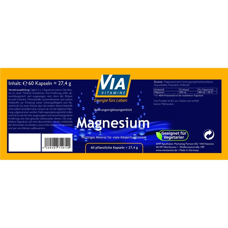 Magnesium 60 Capsules 200 mg Pure Natural, Vegan without Additives, Premium Quality from Germany