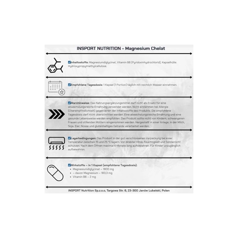 Unser INSPORT MAGNESIUM CHELAT enthält Magnesium-Bisglycinat – eine besonders bioverfügbare Form, die sanft zum Magen ist und vom Körper optimal aufgenommen wird.