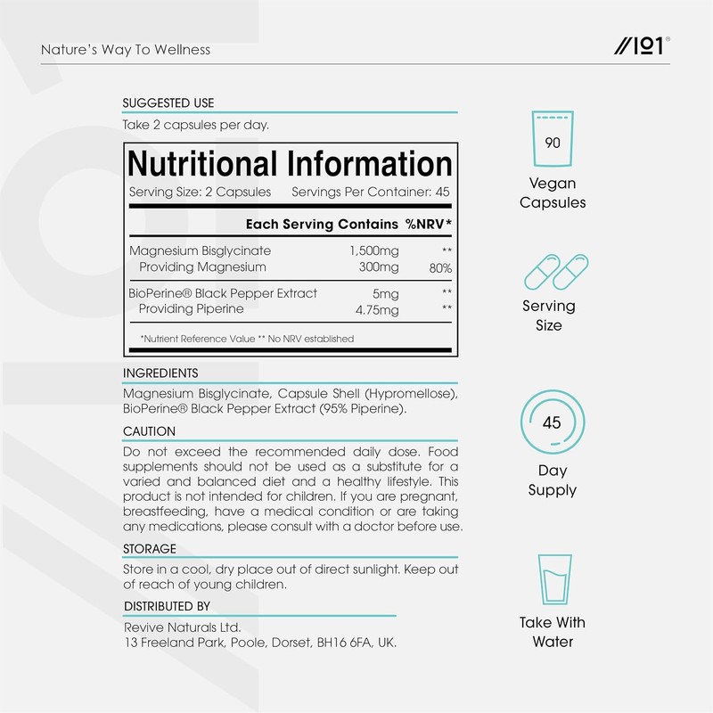 Magnesium Glycinate 1500mg with BioPerine® – Supports The Nervous System - Reduces Tiredness and Fatigue - 90 Vegan Capsules (45 Days Supply) - Resealable and Recyclable Pouch - by Alpha01