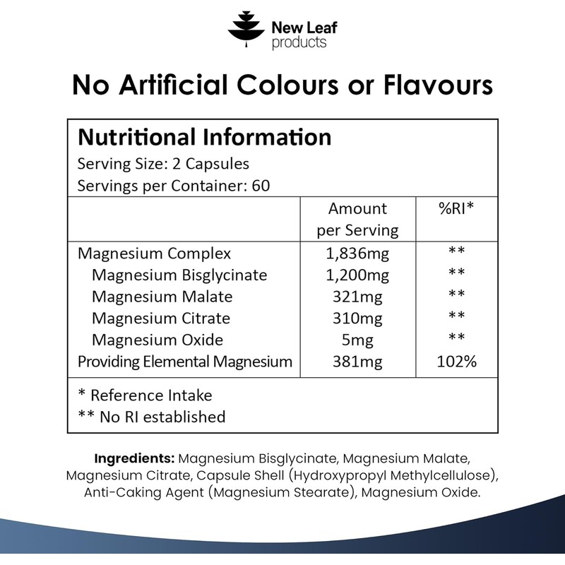 Magnesium Glycinate 4-in-1 Complex 1836mg – 381mg Elemental Per Serving – High-Strength Magnesium with Bisglycinate, Citrate, Malate, Oxide – 120 Vegan Capsules – UK Manufactured by New Leaf