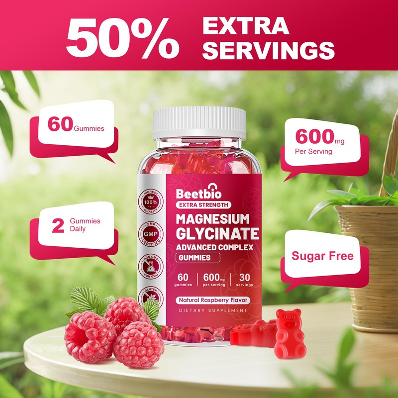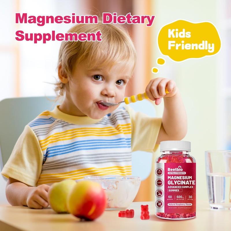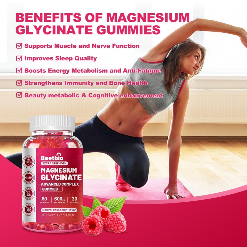 Magnesium Glycinate Gummies 600mg, Chewable Magnesium Glycinate Supplement for Kids & Adults, Magnesium Gummies for Sleep, Muscle & Bone, Sugar Free, Vegan, Raspberry Flavor (60Count)