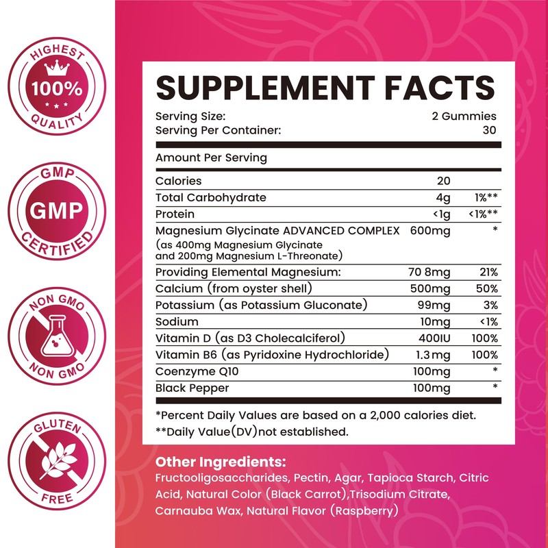 - Magnesium Glycinate Gummies: Magnesium Supplement, added calcium, potassium, sodium, vitamin D, vitamin B6, CoQ10, and black pepper. Magnesium Gummies for Sleep, Stress, Muscle & Nerve.