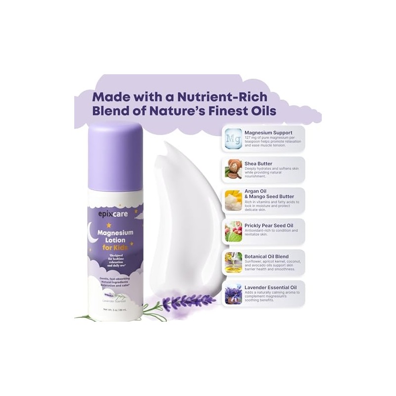 - Lavender Scented for Relaxation: EpixCare Magnesium Lotion for Kids is infused with real lavender essential oil, offering a naturally calming aroma that helps create a relaxing bedtime environment. This soothing scent works with magnesium to help kids unwind after play or a busy day. Free from artificial fragrances, it’s a melatonin free bedtime choice to support a sense of comfort and restful night.