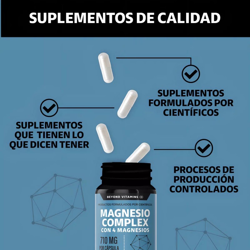 Suplemento avanzado de magnesio con 4 formas para una absorción óptima. Ayuda a mejorar la función muscular, la salud ósea, el sueño, y el bienestar cardiovascular. Ideal para reducir calambres, promover la relajación y apoyar el metabolismo energético.