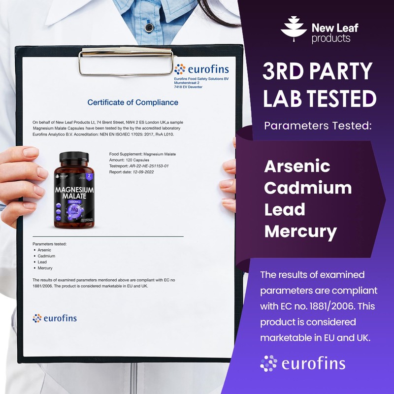 - THIRD PARTY LAB TESTED - Each ingredient is quality tested before our manufacturing process begins, once completed our high strength Magnesium Malate capsules undergoes further rigorous quality testing. Our Magnesium Malate supplements have been 3rd party tested for heavy metals and unwanted compounds by UK & Europe's largest testing facilities (Eurofins) The lab is UKAS accredited according to ISO/IEC 17025:2017.