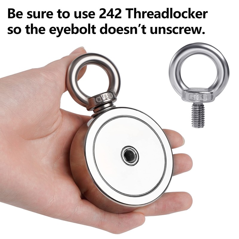 - 【Easy to Use】Be sure to use 242 Threadlocker so the eyebolt doesn’t unscrew. The magnet could provide a two-sided surface to absorb targets, double-sided pulling force will up to 760LBS(344KG) totally (each side 380lbs/172kg).