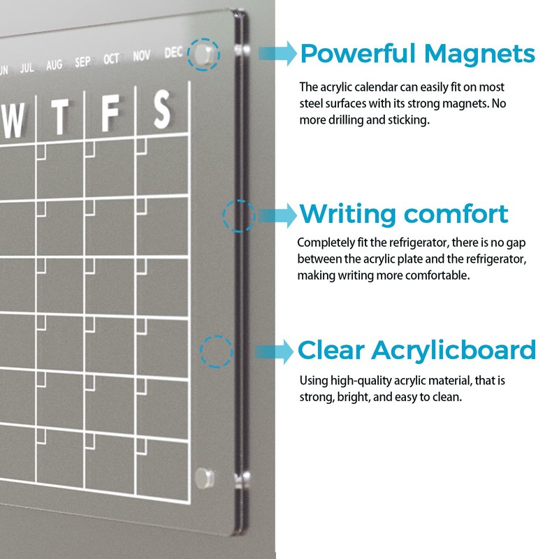 • Magnetic, No Drilling - The acrylic calendar can easily fit on most steel surfaces with its strong magnets. No more drilling and sticking.