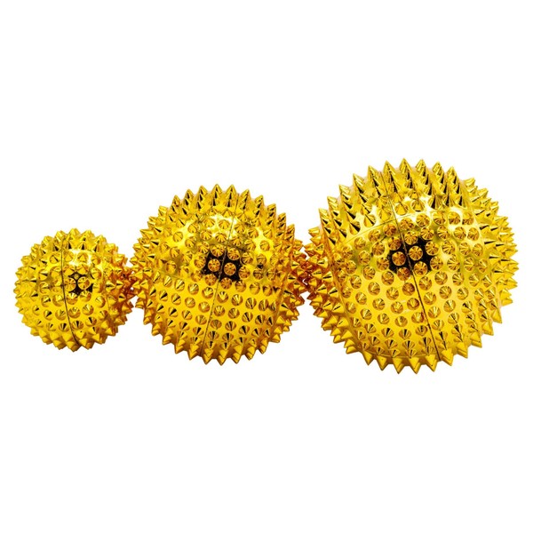 - Set: The set consists of 6 balls in gold with: 2 x 32 mm diameter and 228 acupressure needles, 2 x 47 mm diameter and 414 acupressure needles, 2 x 55 mm diameter and 474 acupressure needles. The balls are manufactured to a high quality and can withstand heavy loads.