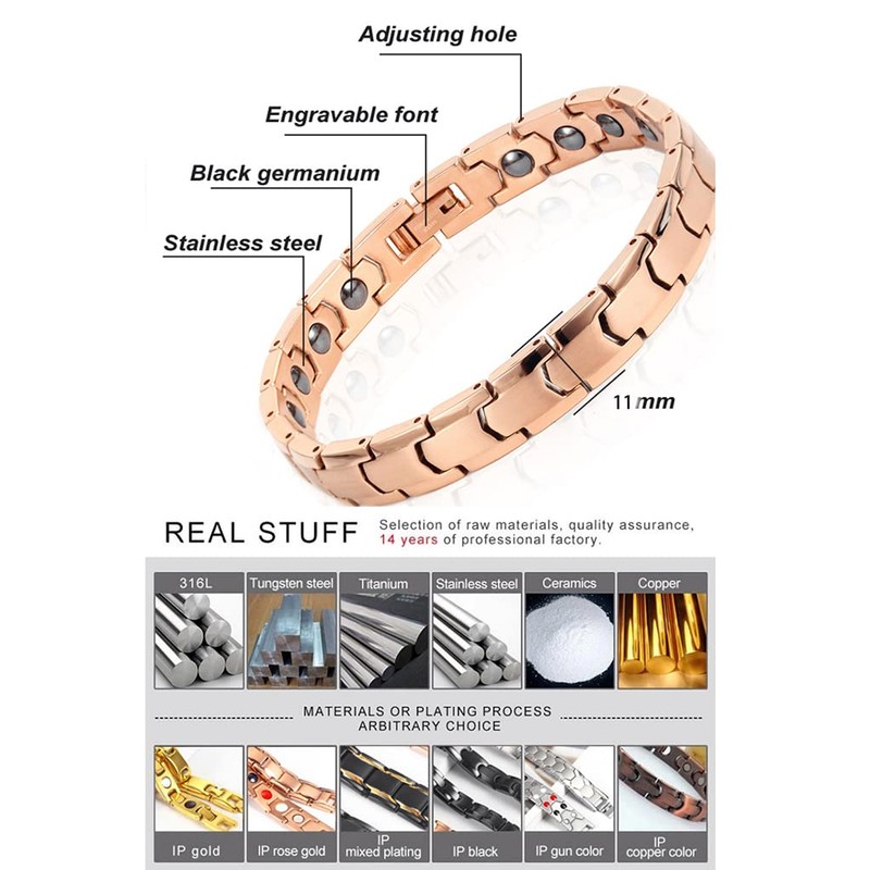 - Titanium steel magnetic therapy bracelet: pure titanium steel material and galvanic coating are 100% hypoallergenic, do not irritate your skin and do not cause allergic reactions to steel and copper. Titanium steel is very strong, lightweight and never rust, making it perfect for everyday use.