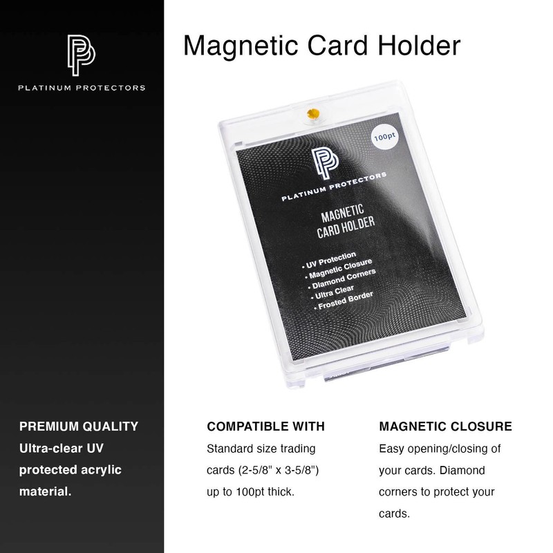 • PREMIUM QUALITY: Crafted from high-grade ultra-clear, acid-free PET plastic, Platinum Protectors magnetic card holders will safeguard your cards from daily wear while keeping them in mint condition for stunning displays.