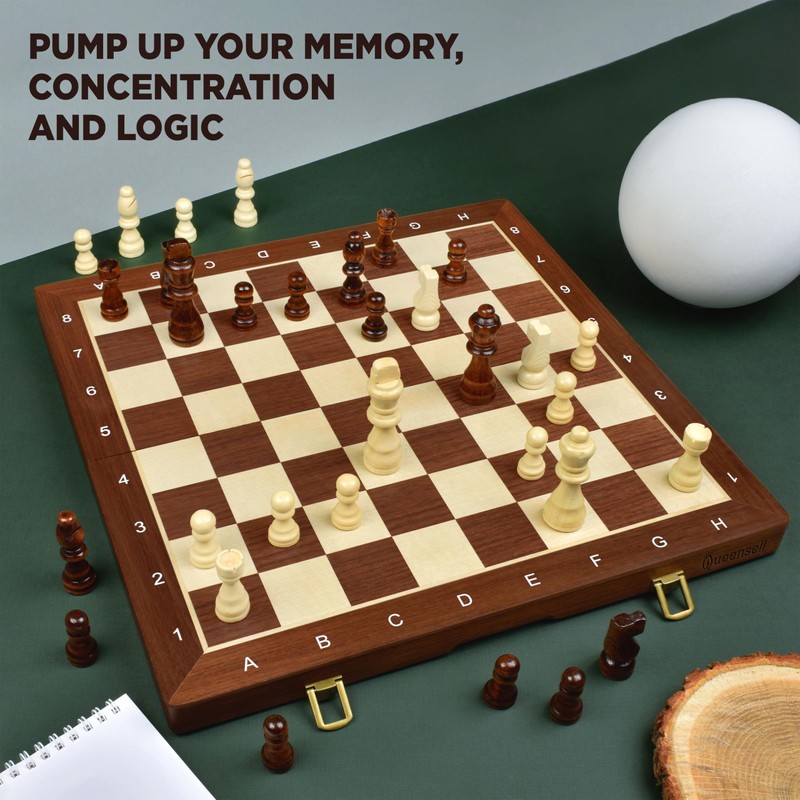 - Full Chess Set - Magnetic Chess Board with Positions, 32 Magnetic Chess Pieces (+2 Extra Queen), 24 Wooden Checkers Pieces