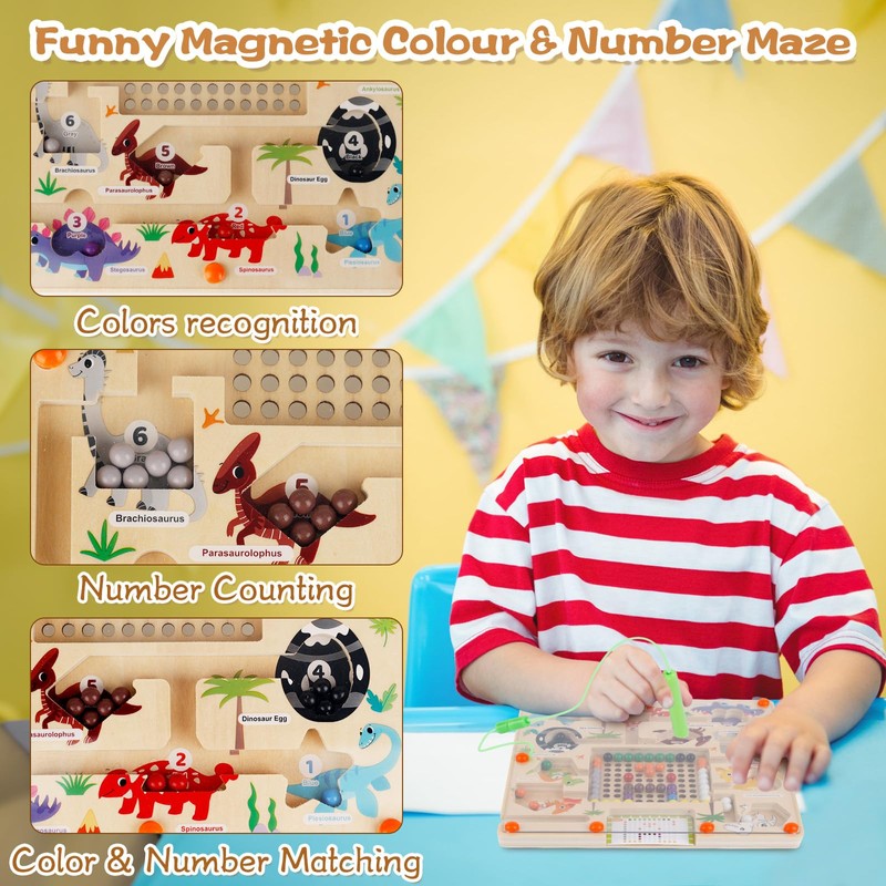 Magnetic Colour and Number Maze, Montessori Magnetic Wooden Maze Board Counting Sorting Matching Games, Educational Learning Dinosaur Magnetic Labyrinth Toy for Kids Toddlers Age 3-6