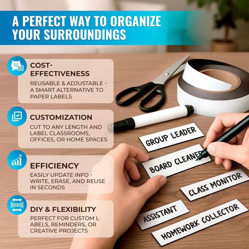 - ✂️ Customizable & Flexible - Easily cut our white magnetic strip to any length you need with standard scissors. Use a single magnetic dry erase strip for names, labels, roles, or reminders at school, in the office, or around the house for perfectly tailored organization.