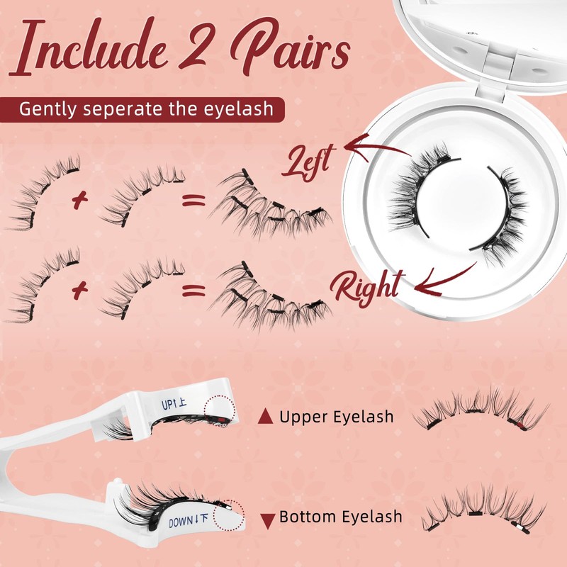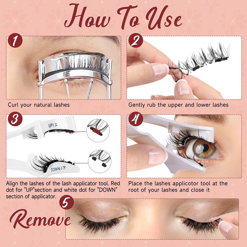 - Usage Tips: 1. When taking out the magnetic eyelashes from the eyelash base, you should gently rub them to separate them into two pieces. 2. Put the magnetic eyelashes with red dots on the "upper" part and the eyelashes with white dots on the "lower" part. Make sure both parts are bent upward. 3. When wearing the magnetic eyelashes, you need to align the root of the eyelashes with the applicator and then gently close the applicator.
