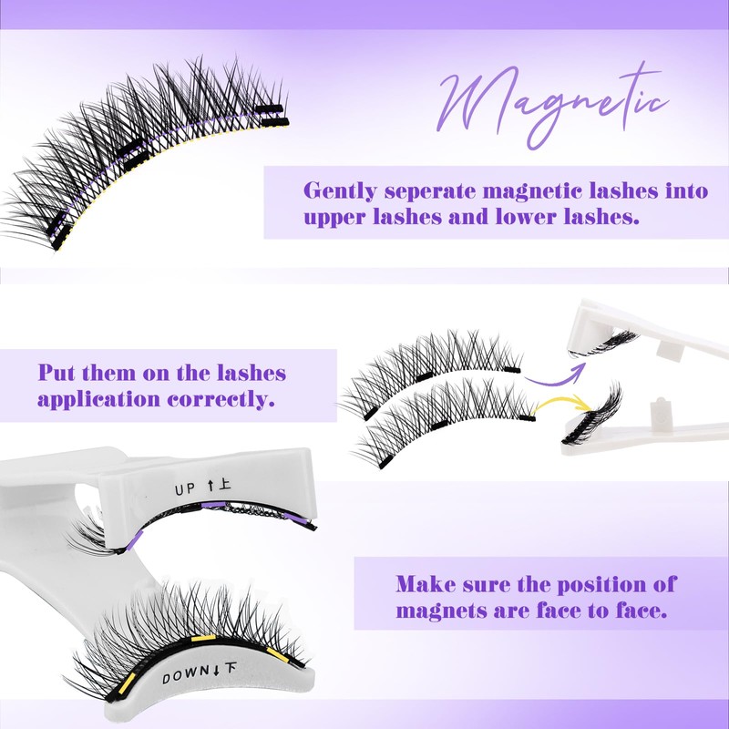 - How to Use: This magnetic eyelash kit with applicator is very easy to wear and beginner friendly. First of all, roll your eyelashes, secondly, gently divide the upper and lower lashes into two sections, place the upper and lower lashes in the correct position of the applicator, and finally, gently place the upper part of the eyelash applicator on the root of the natural lashes, gently press the lashes closed to ensure that the lashes are fixed, and then complete the wearing of the kit