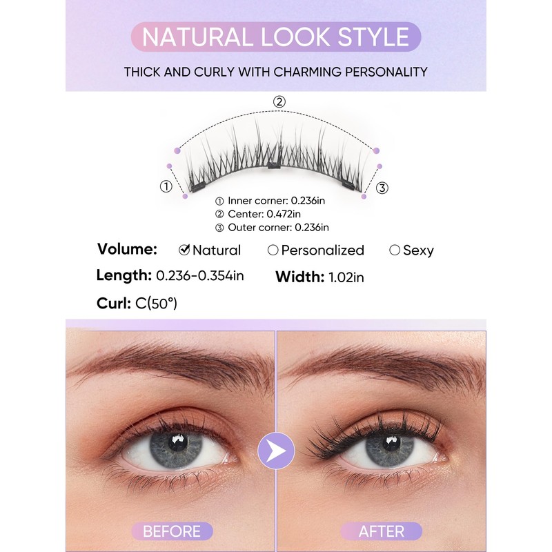 - Natural Sweet Style: Designed for a natural sweet look, these magnetic eyelashes (model URS01) are perfect for everyday light makeup, glamorous makeup, and bold styles. Featuring moderate density, 50° curl, lash sizes ranging from 0.23in-0.47in, and a stem length of 1.02in, they provide an authentic appearance