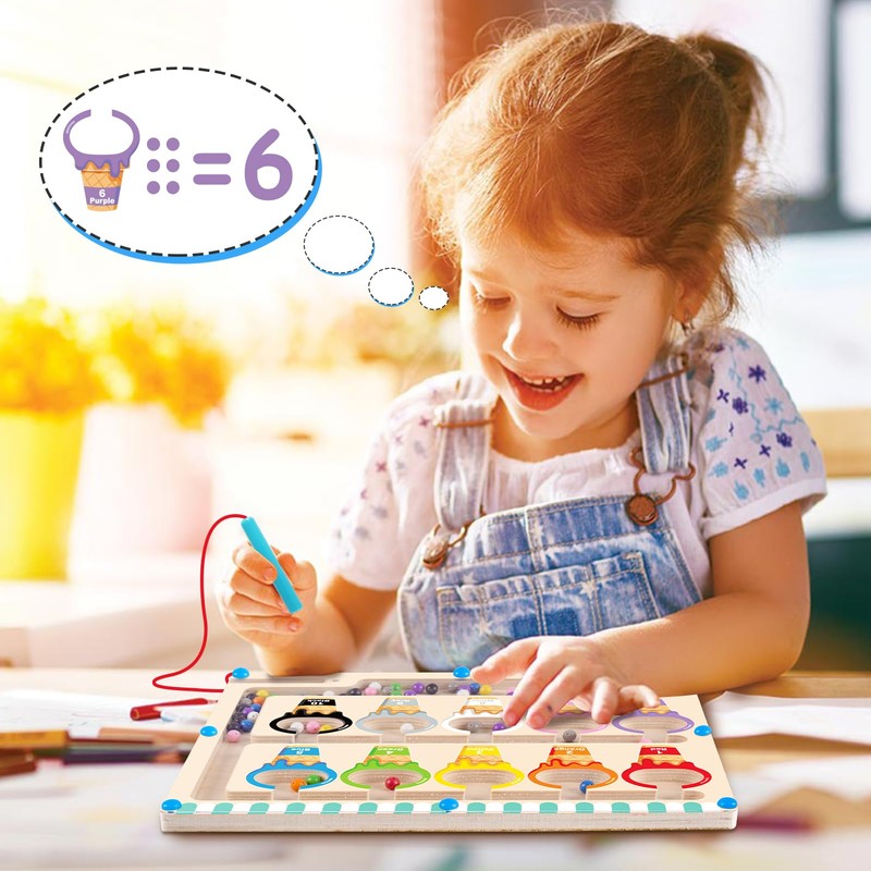 - Magnetic game Montessori toy: Our wooden magnetic labyrinth contains 10 built-in "ice creams" that represent the numbers 1-10, and 55 magnetic beads in 10 bright colours for children to assign and count. By using the magnetic stick to move the beads into the ice cream, children can easily match numbers and colours and practice finger/hand dexterity. Note: Please keep the pen upright for better use.