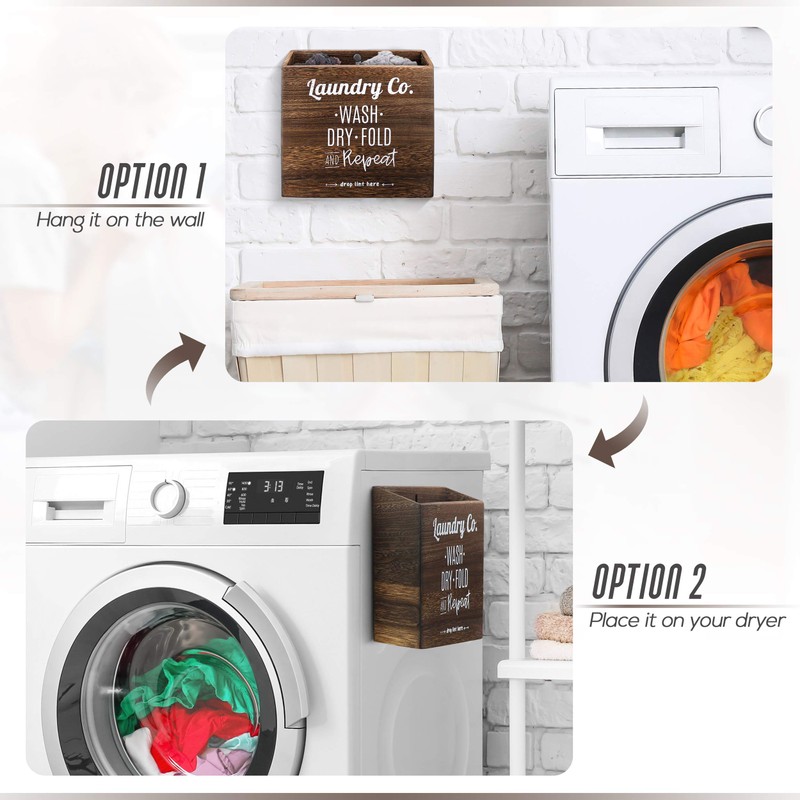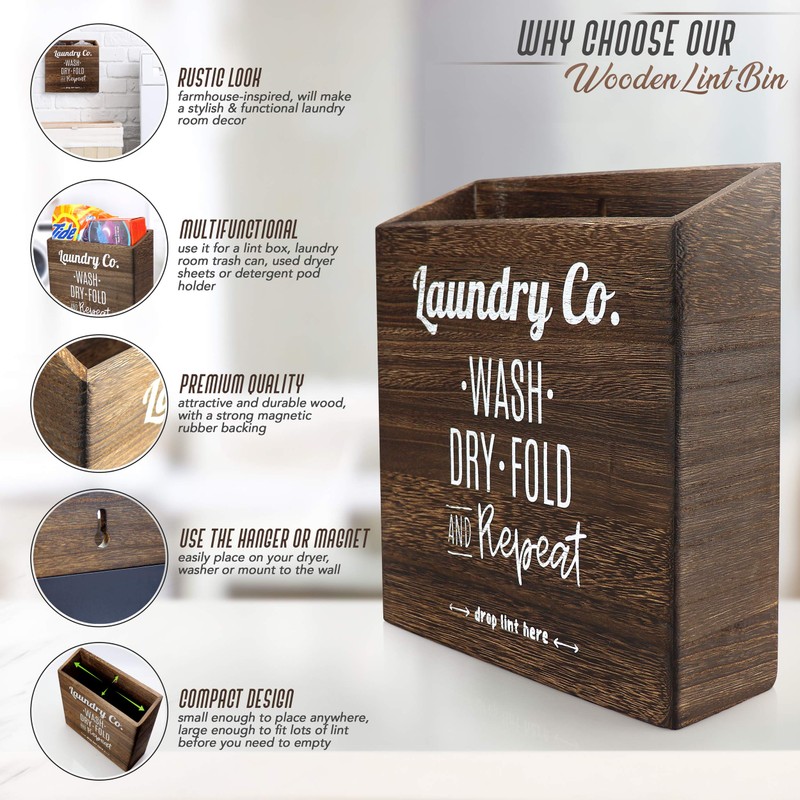 - Wherever You Wish – Select the spot that suits your needs! Crafted of wood, your lint holder mounts to the wall or sticks to your washer or dryer thanks to its magnetic back and keyhole hanger.