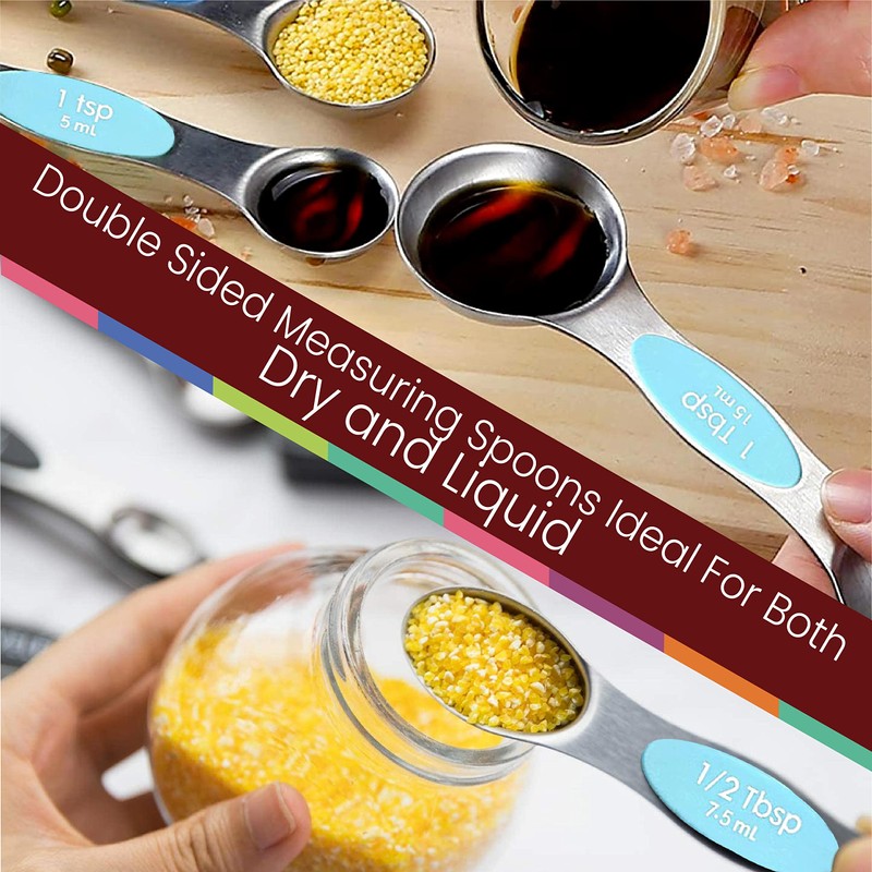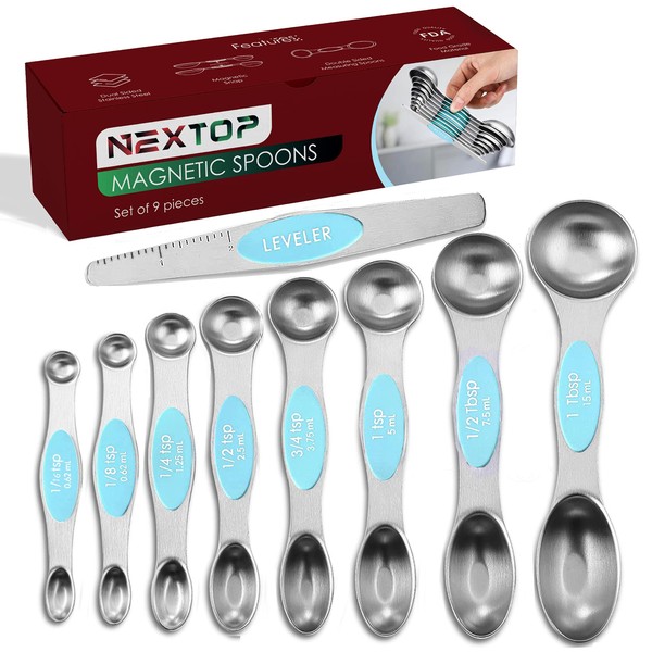Magnetic Measuring Spoons Set of 9 Stainless Steel Dual-Sided Stackable Measuring Spoon Nesting Teaspoons Measuring Dry and Liquid Ingredients, Fits in Spice Jars Set of 9 (Blue (Aqua Sky))