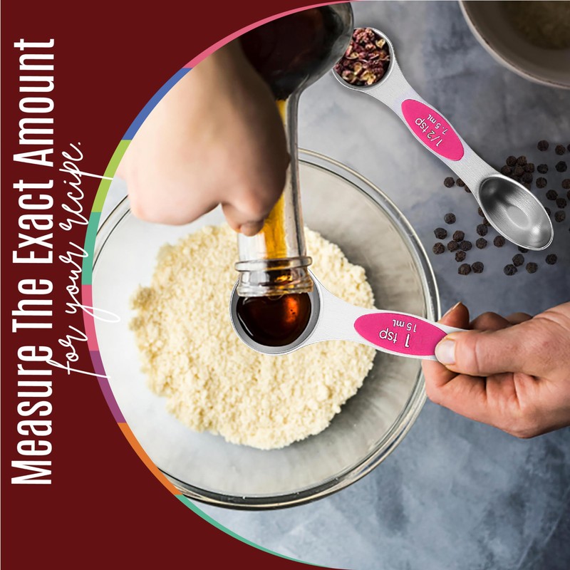 - Premium Quality: Our measuring spoons are made from high-quality 304 stainless steel, which is durable, rust-proof, and easy to clean. The dual-sided design allows you to measure both dry and liquid ingredients with ease.