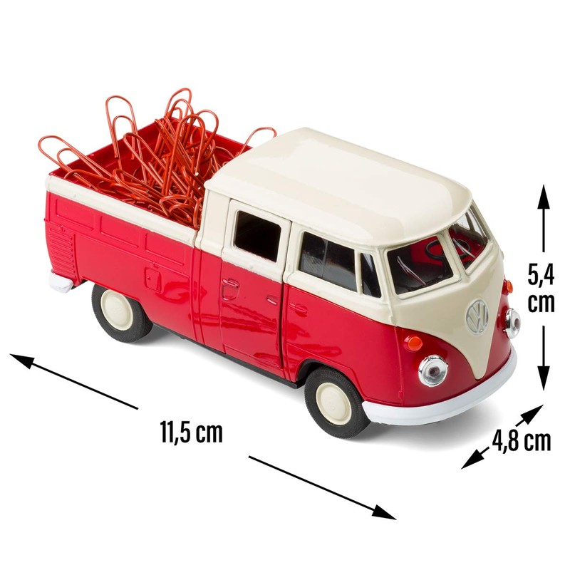 We have something very crazy for you! This VW flatbed truck with double cab (lovingly called Doka) is equipped with a hidden extra strong magnet under the loading area. This magically attracts paper clips and keeps your desk tidy and also at the workplace. The rolling dispenser eliminates the daily mess, keeps the clips handy and ensures the end of the paper economy.