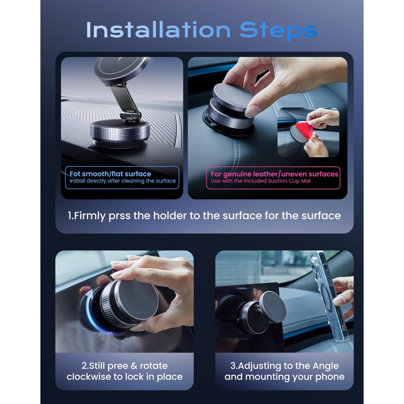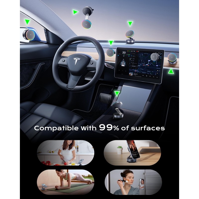 - 【Suction Pad with TPU Glue-Fit for 99% Position】- This upgraded magnetic wireless charging mount features dual technology with vacuum suction and TPU glue, ensuring a firm grip on both textured and smooth flat surfaces. It is suitable for car windows, dashboards, center screens, armrests, mirrors, glass countertops, marble, tiles, gym equipment, and more. Perfect for a wide range of scenarios including driving, workouts, bathing, cooking, or makeup routines