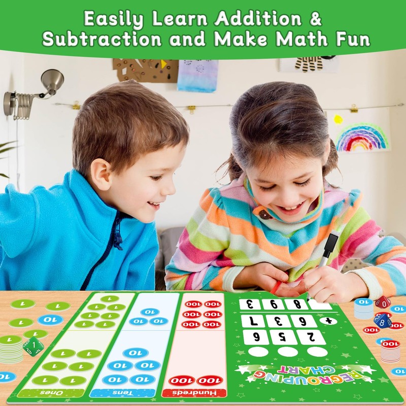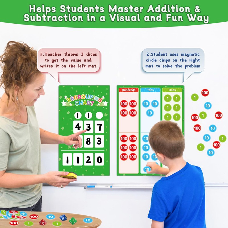 - 🔵【Hands-on Learning Addition & Subtraction】Magnetic place value chips and dices of the same color represent different place values, green for ones, blue for tens and red for hundreds; Roll 3 dices to randomly create 3-digit math addition and subtraction formulas and write them on a magnetic regrouping math place value mat, and finally use magnetic chips to solve math problems; Math classroom must haves