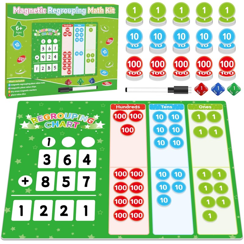 - 🟢【66PCS Upgraded 4-Digit Grids Place Value Kit】The 2024 new upgraded magnetic math manipulatives kit helps students master addition and subtraction, making learning math a fun game; 66 pieces are sufficient for teachers and children: 1 dry erase marker, 3 place value dices, 2 magnetic regrouping place value mats, 20 magnetic round chips of ones, 20 magnetic round chips of tens, 20 magnetic round chips of hundreds