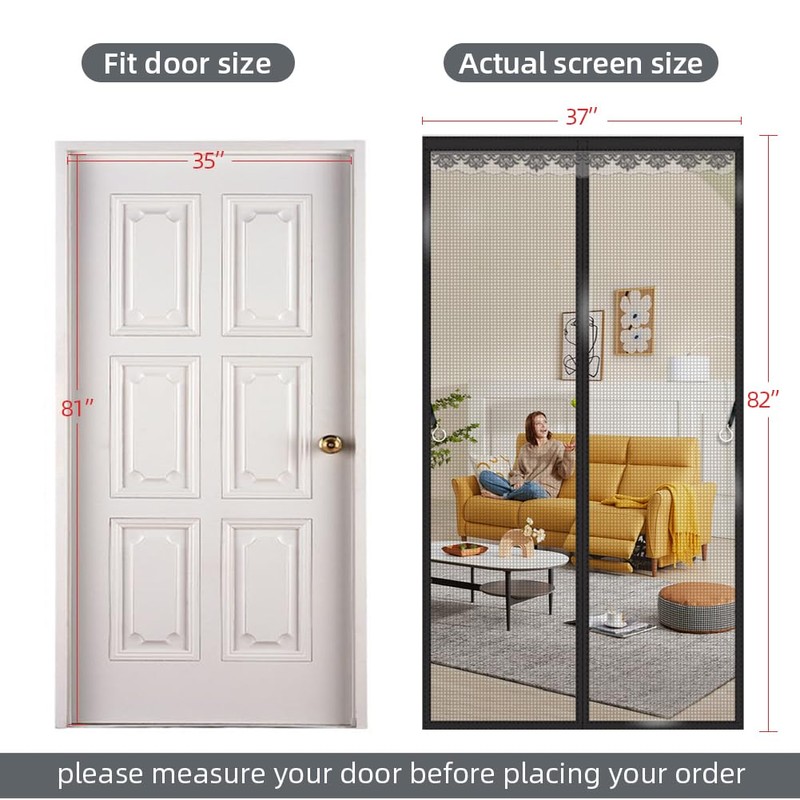 - 【Choose The Right Size】For other sizes, welcome to inquire in the store。 The size of this magnetic screen door is 37"x82"-- Fits Door Size up to 36"x82" Max(NOT INCLUDE DOOR FRAME). This screen door mesh with magnetic closure can be attached easily to your balcony door, bedroom, kitchen, children's room or sliding door. Please measure your door frame before purchasing.