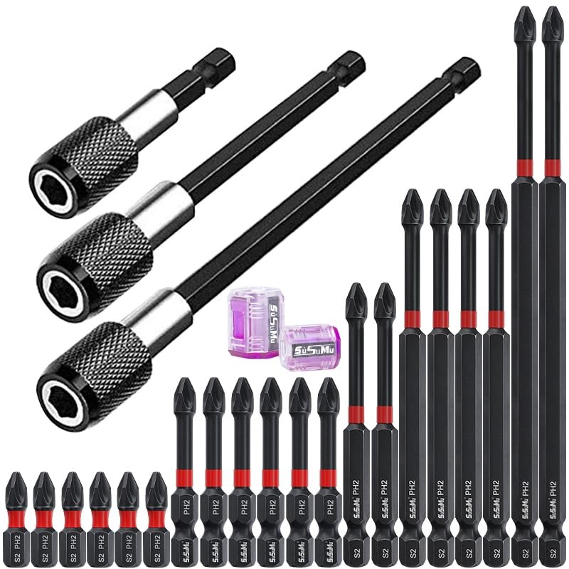 Magnetic Screwdriver Bit Set, 1/4 Inch Hex Shank PH2 Screwdriver Bit Set With Anti-slip Drill Bit Extender And Magnetic/Demagnetization Circle, Power Tool Accessories For Home Building(25Pcs)