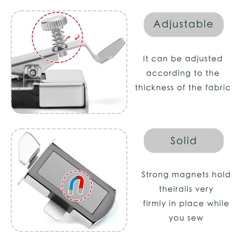 - Our magnetic seam guide with clip is made from high-quality stainless steel and magnets, durable, good fixation and long-lasting. It provides edge protection, helps with positioning, and prevents fabric from curling. The magnet stays securely in place while you're sewing, so you can work with stability and accuracy.