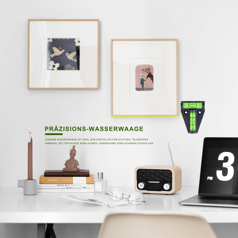 - In addition to being used in the camping, caravan and caravan area, this mini spirit level is also versatile in the home. It is ideal for attaching pictures, TV wall brackets, furniture and shelves. It is also a practical helper as a tripod accessory.