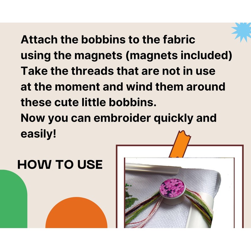 Attach the bobbins to the fabric using the magnets (magnets included).