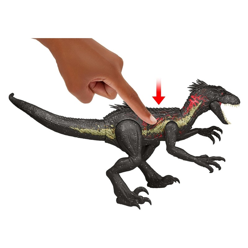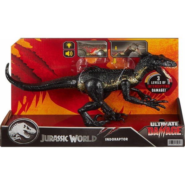 - Lights, sounds, attack! This Jurassic figure of the hybrid Indoraptor has Ultimate Damage style, featuring lights, sound effects and an attack motion on this fierce aggressor!