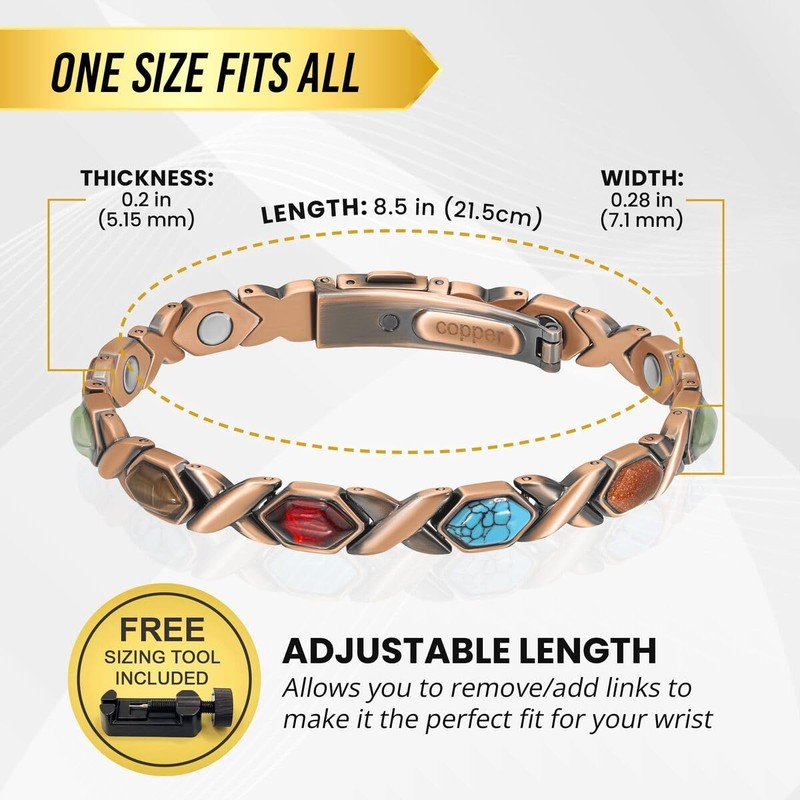 - Adjustable Fit: This magnetic bracelet comes with a measuring of 8.4 inches (21.50cm) in length with a FREE sizing tool to ensure the perfect fit. The adjustable design ensures comfort and flexibility, making this copper bracelet women suitable for various wrist sizes. The magnetic properties, combined with the unique stones, create a functional and stylish accessory.