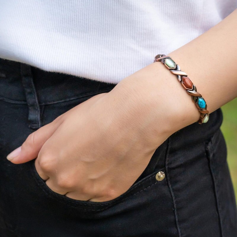 - The Perfect Gift: The MagnetRX womens copper bracelet showcases a blend of five unique stones, adding both color and elegance to any accessory collection. This versatile piece is perfect for both casual and formal wear. Presented in a luxurious gift box with a velvet pouch and sizing tool, it's a thoughtful and cherished gift choice for any occasion.