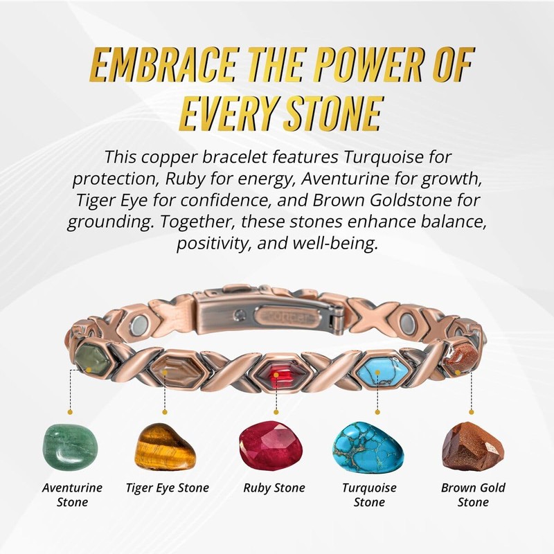 - Ultra Strength Magnets: Experience the unique mixed Stone Design's elegance with our copper magnetic bracelet featuring 5 unique stones, including vibrant Turquoise, Ruby, Adventurine, Tiger eye and Brown goldstone. This magnetic bracelets for women design combines the beauty of colorful stone jewelry with the wellness benefits. Our magnetic copper bracelet contains 10 powerful neodymium magnets, each creating a magnetic field with a strength of 3,500 gauss.