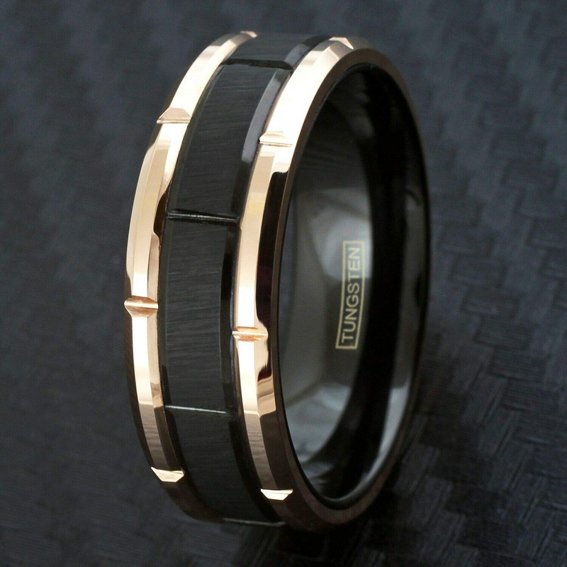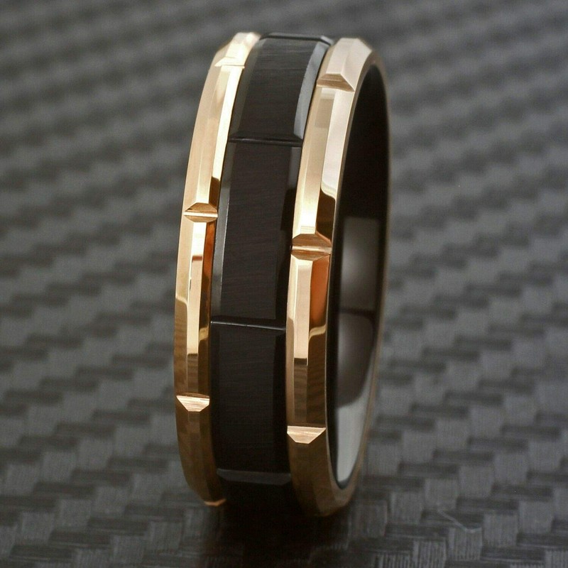 - Gorgeous 8mm Rose Gold Notched Tungsten Carbide Band Style Ring with Notched Edges and Notched Piano Black Satin Finish Center Band.