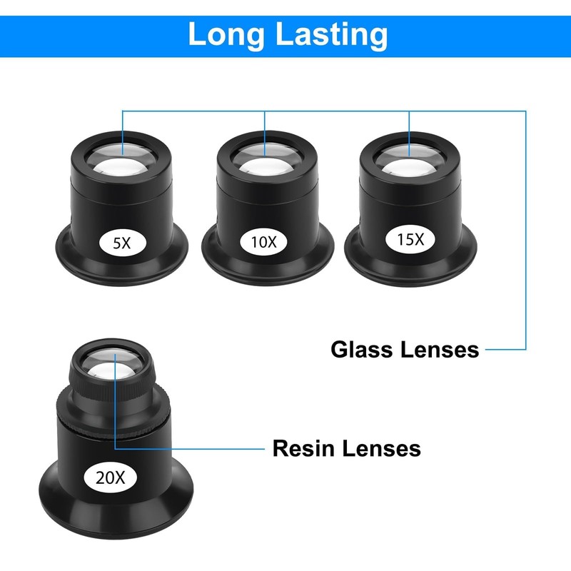 - Long-Lasting: The 20X loop magnifier is made of resin glass, which is high-temperature and UV resistant. The 5X, 10X, and 15X magnifiers for close work are made of optical glass, offering excellent clarity. Different magnifications cater to various needs.