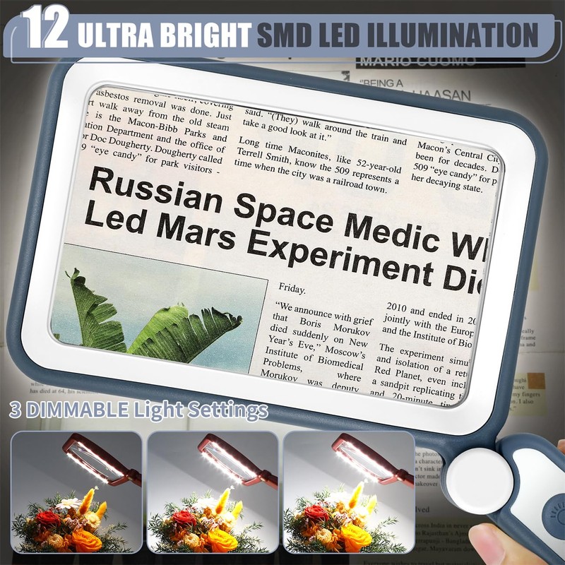 • Touch Switch & Adjustable Lighting: The full page magnifier has 12 super-bright LEDs. Easily illuminate your reading material. Simply touch the on/off switch on the magnifier handle to set the desired brightness easily. The LEDs provide bright, even light to ensure every detail is visible, reducing eye fatigue and improving the overall viewing experience. A perfect aid for seniors suffering from ageing eyes and macular degeneration.