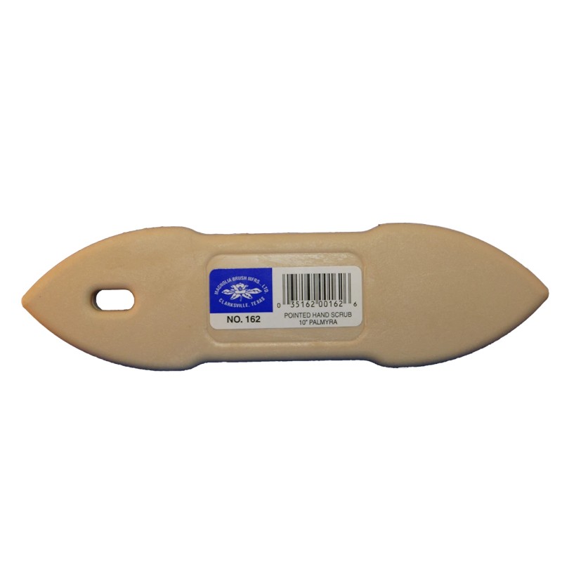Magnolia Brush 162 Palmyra Pointed Scrub Brush features durable natural fibers staple set in a sturdy plastic block, designed for heavy-duty scrubbing. Pointed end for precision cleaning in corners and tight spaces. Includes hanging hole for convenient storage.