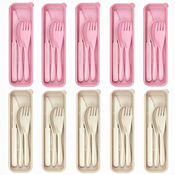Magnoloran 10 Set Reusable Travel Utensils Set with Case,Wheat Straw Travel Cutlery Set Portable Knife Fork Spoons Tableware Picnic Silverware for Party, Picnic, Camping, Kitchen, Camping-Beige&Pink